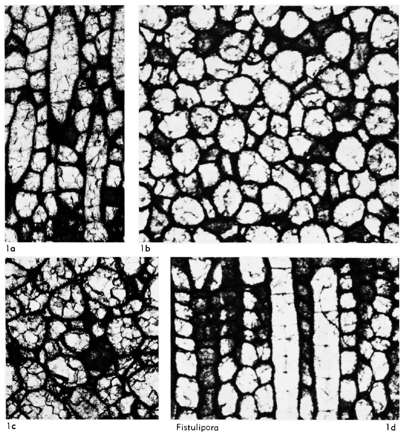 Fig. 173, la-d. *F. minor, paratype, SM 315, a, angular to blisterlike vesicles and closely spaced diaphragms in autozooecia in outer exozone, granular to granular-prismatic microstructure, transv. sec., x30, b, lunaria with short radius of curvature and granular microstructure in rounded autozooecia partially isolated by moderately large polygonal vesicles, tang. sec., x30, c, subangular autozooecia with lunaria, partially isolated by polygonal vesicles in endozone; transv. sec., X30; d, tubular autozooecia with closely spaced planar diaphragms isolared by boxlike to polygonal vesicles; long. sec., X30 (a and c are photographs of a section figured by BASSLER, labeled SM 315; band d are photo- graphs furnished by A. G. BRIGHTON of presum- ably the same paratype, SM 315, W. Hopkins ColI., bearing the additional number E53 73b).