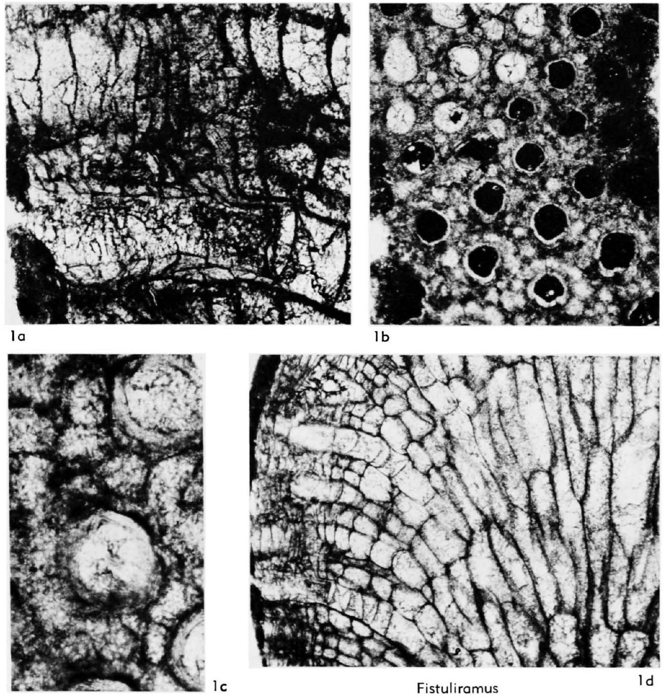 Fig. 185, 1ad. * F. sinensis, paratype, PIN 124-7/32, a, autozooecium with closely spaced diaphragms and laminated lining with tubules in living chamber (below, left), low, blisterlike vesicles with zone of thicker roofs (above, center), long. sec., x100, b, autozooecia with light-colored lining and hyaline lunaria isolated by small subcircular vesicles, tang. sec., x30, c, laminated autozooecial lining, light-colored lunaria, and small vesicles, tang. sec., x100, d, thin-walled autozooecia and long, blisterlike vesicles in endozone (right), closely spaced diaphragms in inner exozone and decrease in vesicle height in exozone, long. sec., x30.