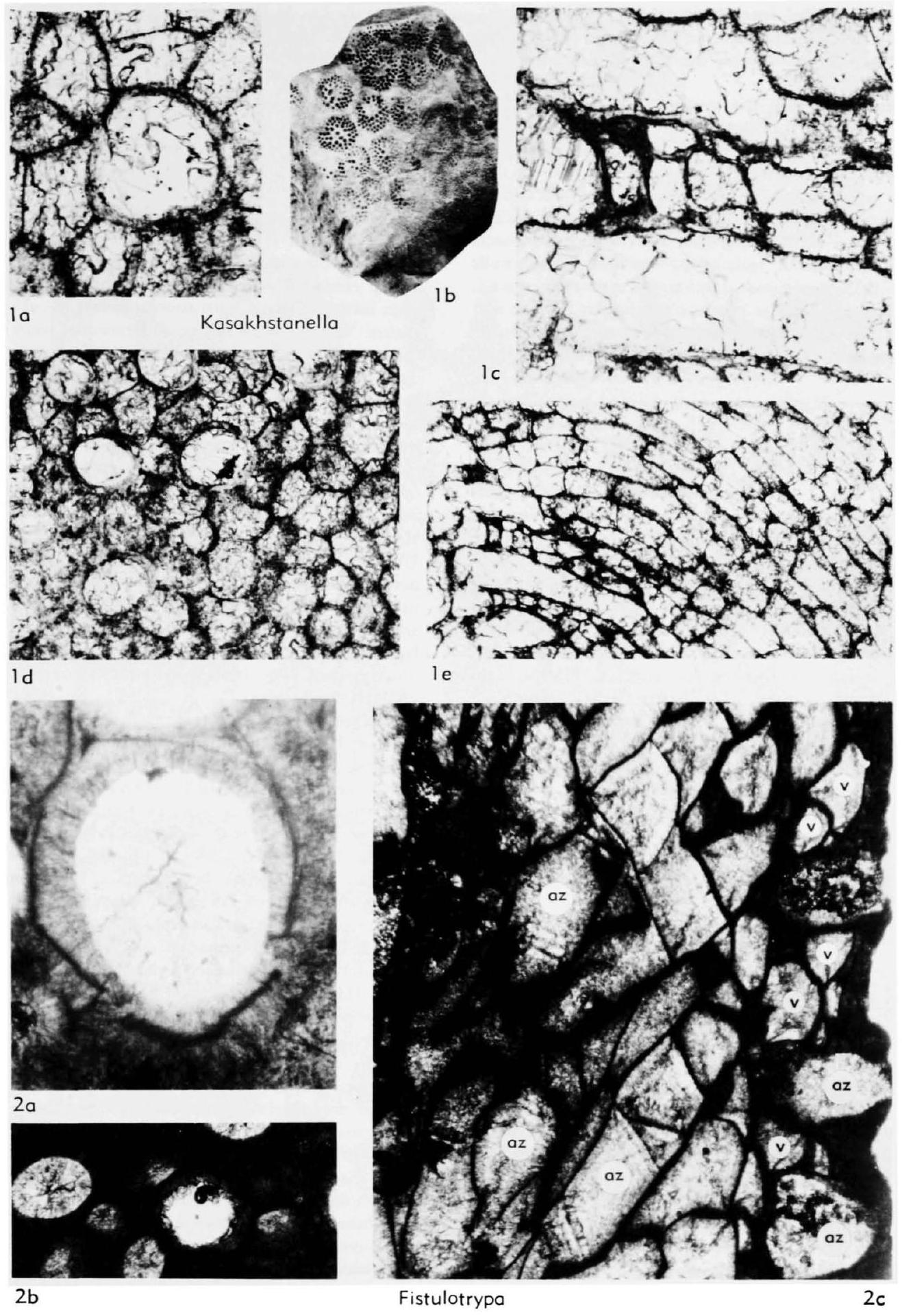 Fig. 187, 2a-c. *F. ramosa, type, USNM 159822, a, dark granular boundary, granular-prismatic cortex and lunarium (lower side) in autozooecium, tang. sec., x100, b, dark granular zooecial boundaries and subcircular vesicles, tang. sec., x30, c, large, thin-walled autozooecia (az) in endozone (left), thicker-walled autozooecia (az) and vesicular tissue (v) in exozone (right), oblique long. sec., x30.