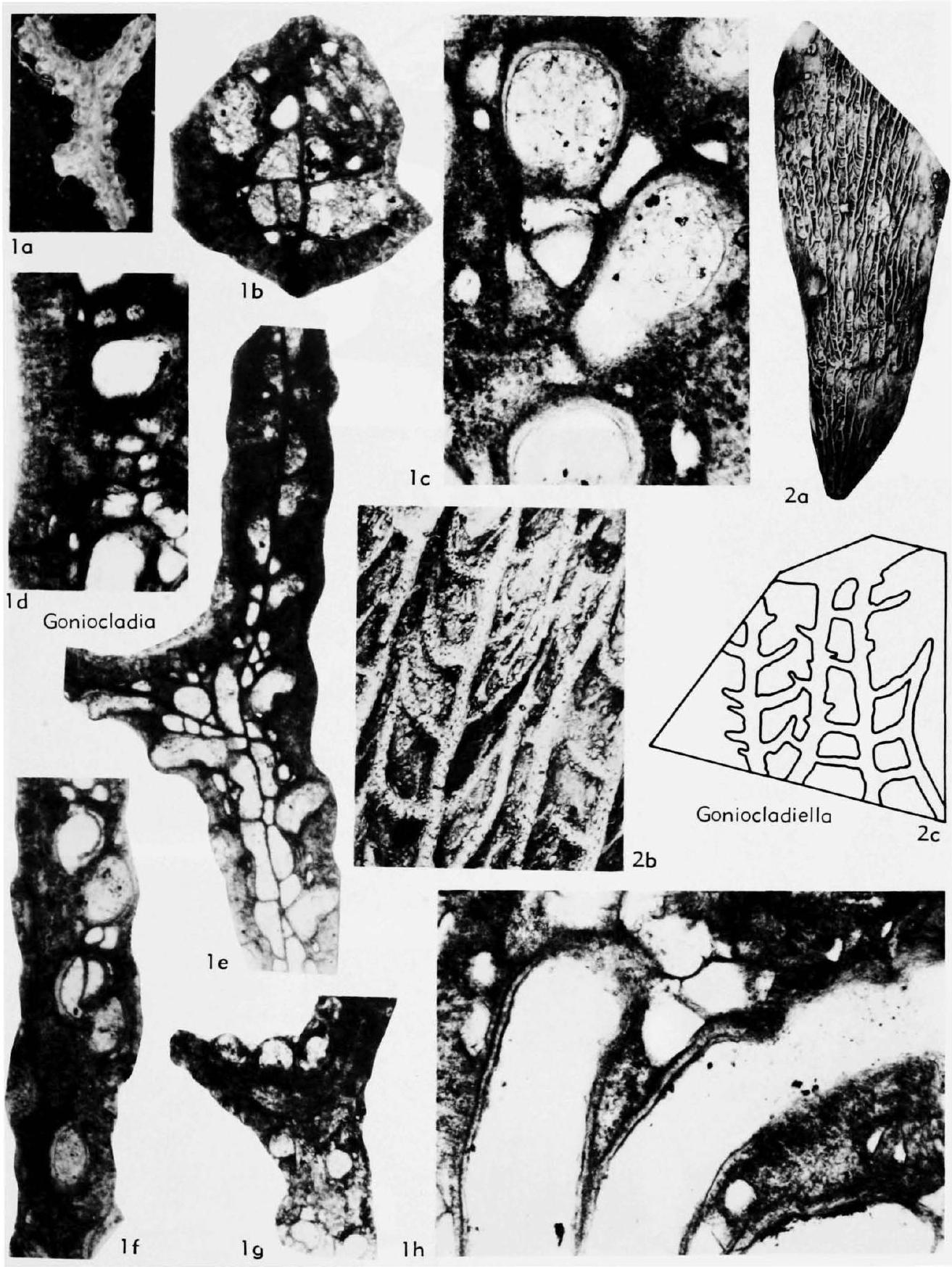 Fig. 213, 1a-b. *G. cellulifera (Etheridge), a, branching zoarium, elevated lunaria, topotype, BMNH D32637, x9, b, vertical mesotheca, vesicles and stereom in exozone, stereom on reverse side (below), transv. sec., topotype, BMNH D 32637-3, x50, c, laminated walls and lunaria with tubules on outer side (right), stereom with numerous acanthostyles, tang. sec., topotype, BMNH D32637-2, x100, d, solid reverse side (left), autozooecia and vesicles in endozone, oblique long. sec., topotype, BMNH D326377, x50, e, mesotheca, autozooecia curve distolaterally, vesicles in outer endozone, stereom in exozone, tang. sec., topotype, BMNH D326375, x30, f, mesotheca (left), autozooecia isolated by stereom and vesicles, lunaria on outer (right) side, tang. sec., topotype, BMNH D32637-4, x50, g, subcircular autozooecia, tang. sec., topotype, BMNH D32637-7, x30, b, wall microstructure, vesicles and stereom, long. sec., topotype, BMNH D32637-7, x100."