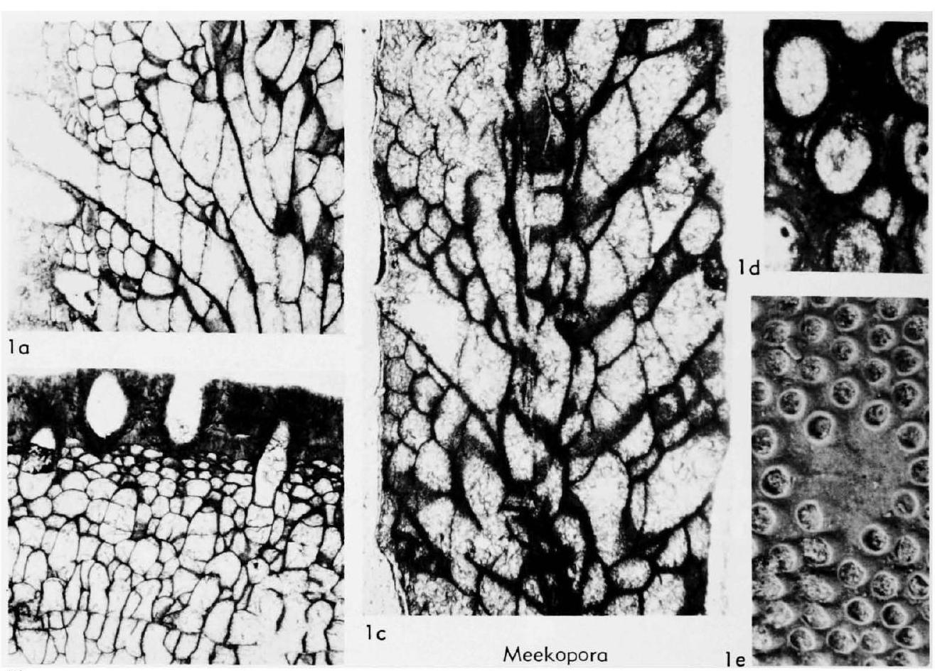 Fig. 201, 1a-e. *M. clausa (Ulrich), a, closely spaced diaphragms in endozone and inner exozone, vesicles decreasing in height outward, stereom at surface, long. sec., lectotype, USNM 159834, x20, b, thin mesotheca, boxlike to hemispherical autozooecia, large vesicles in endozone, stereom at surface, transv. sec., lectotype, x20, c, crushed endozone, autozooecia isolated by blisterlike vesicles in exozone, distal "wall"' of autozooecium (right center) of superimposed vesicle walls; long. sec., paralectotype, USNM 159835, X30; d, elongate autozooecia narrowly isolated by small vesicles; tang. sec., paralectotype, USNM 159836, X30; e, solid monticular center, autozooecia with peristomes and lunaria; paralectotype, USNM 159837, x10.