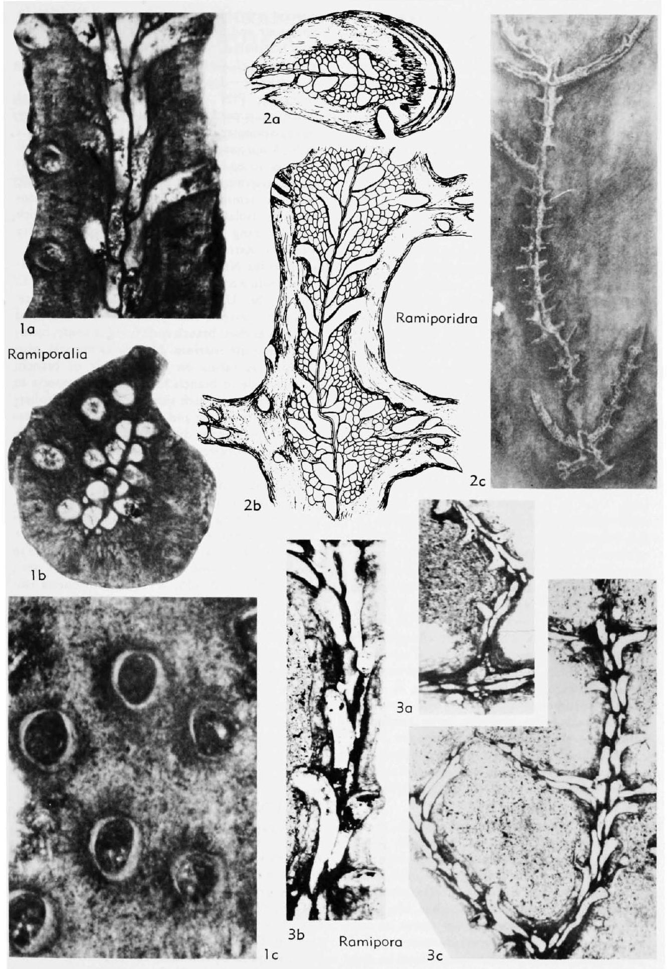 Fig. 215, 2a-c. *R. uralica (Stuckenberg), a, vertical mesotheca, vesicles in endozone, stereom in exozone, transv. sec., TsGM No. 982/305, x11, b, autozooecia isolated by vesicular tissue at mesotheca, laminated stereom in outer exozone, deep tang. sec., TsGM No. 982/305, x11, c, primary, secondary, and tertiary branches, median carina, few ranges of autozooecia on obverse side, holotype, Museum, State University of Kazan, Xl (photograph courtesy of V. P. Nekhoroshev)."