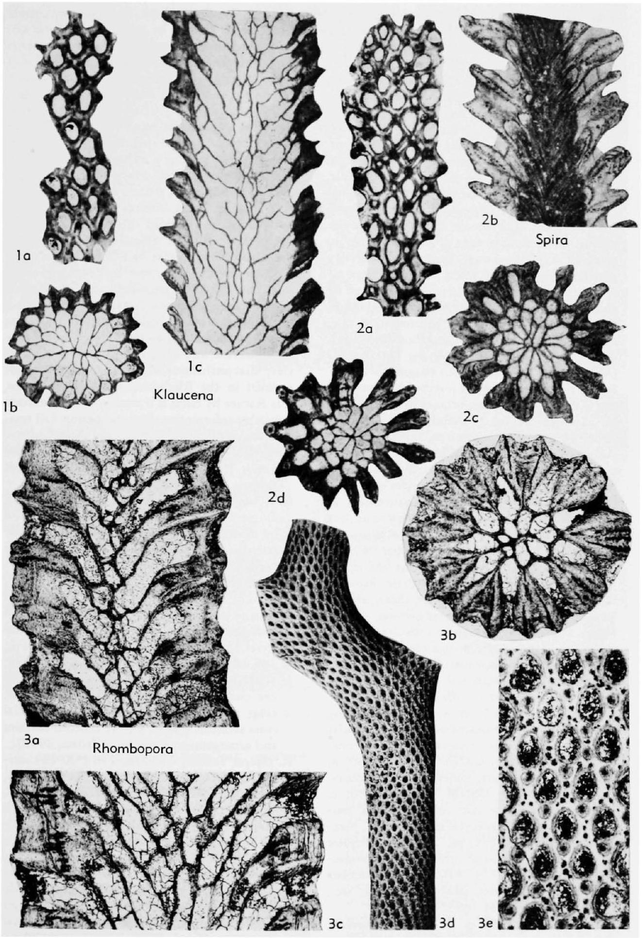 Fig. 286, 3a-e. *R. lepidodendroides, a, irregular branch axis, zooecial shapes, broad exozone, long. sec., lectotype, USNM 168360, x30, b, zooecial cross sections, lamellar profile, transv. sec., paralectotype, USNM 168360, x30, c, elongate zooecia near axis, zooecial shapes, narrow exozone, stylet arrangement, long. sec., paralectotype, USNM 168359, x30, d, irregular growth habit, apertural arrangement, paralectotype, USNM 240773, x10, e, living chamber outlines, acanthostyles, paurostyles, tang. sec., paralectotype, USNM 168359, x30.